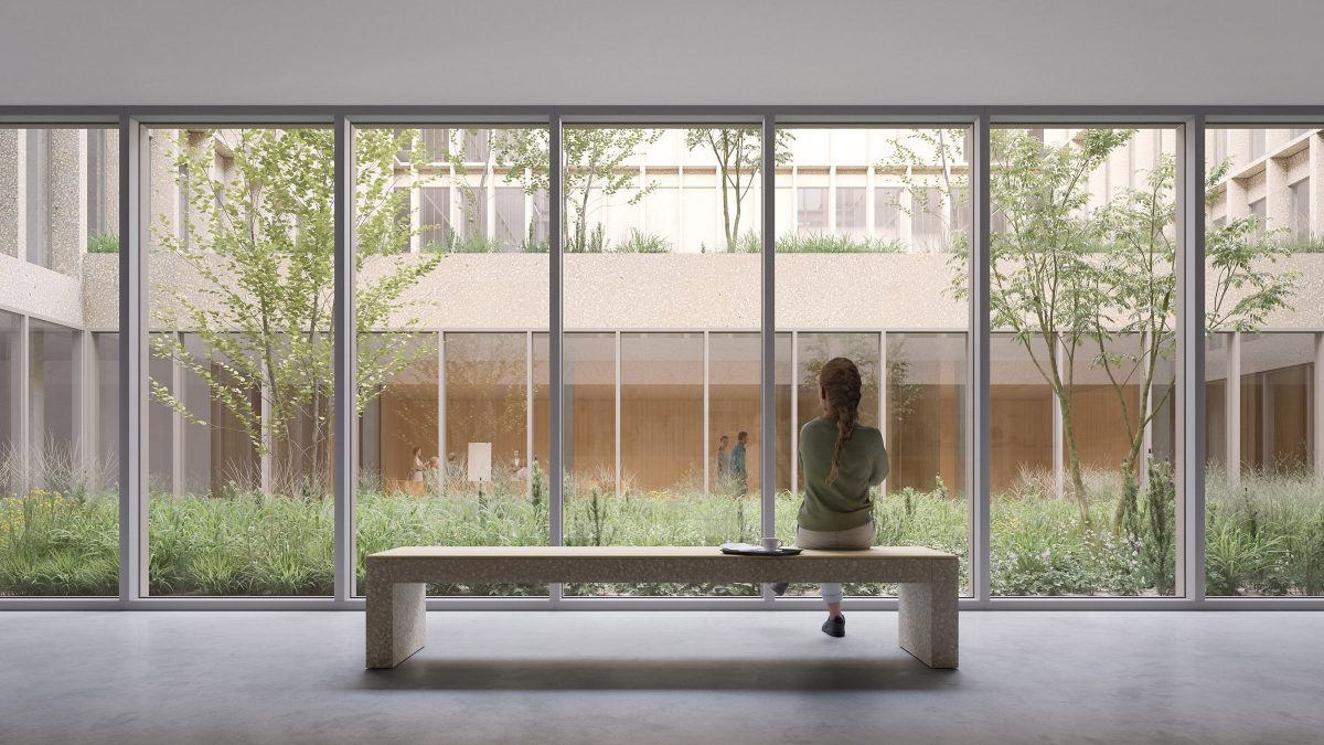 Im ersten Schritt wurde untersucht, ob in dem Bestandsgebäude genug Potenzial steckt, es zu erhalten und zusammen mit einem Erweiterungsbau ein neues Ensemble zu schaffen. Sehw griff sowohl beim Umgang mit dem Bestand als auch beim Neubau das Serielle als gestalterisches Prinzip der Fassaden auf. Die neuen Fassadenelemente aus Werkstein werden aus Recyclingmaterial des Bestands hergestellt. Das Ensemble umfasst zwei L-förmig aneinanderstoßende Büroriegel sowie eine eingeschossige Hofüberbauung, die Nutzungen wie Konferenzbereiche, Lounge und Caféteria aufnimmt.